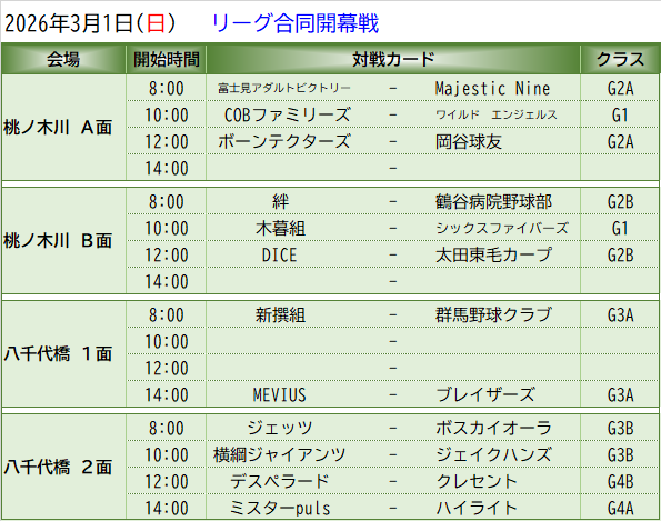 2026年リーグ編成、開幕戦カードが決まりました~2026年2月1日UP